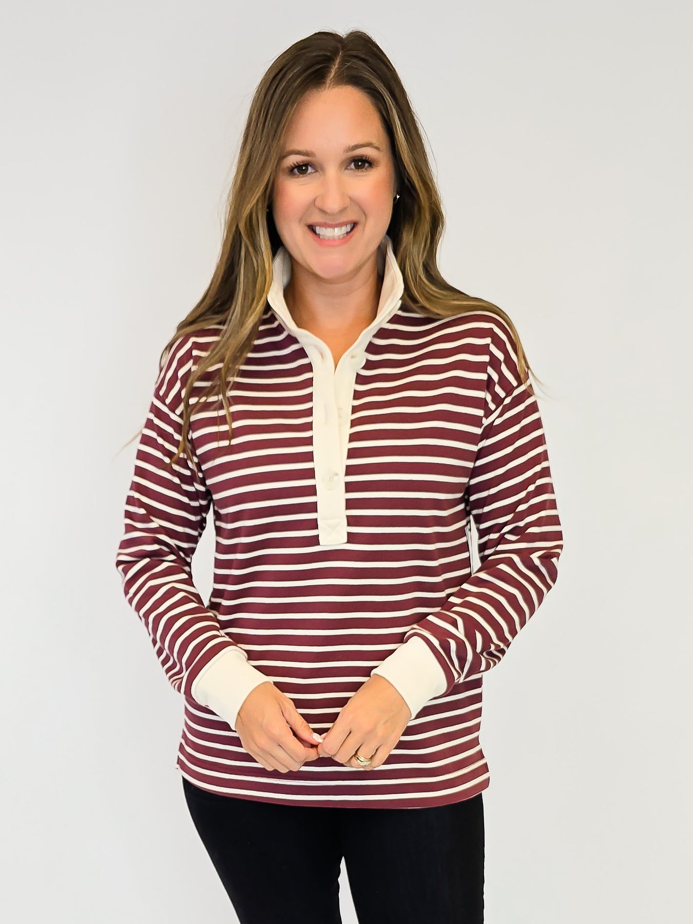HALF BUTTON COLOR CONTRAST STRIPED SWEATSHIRT - BURGUNDY