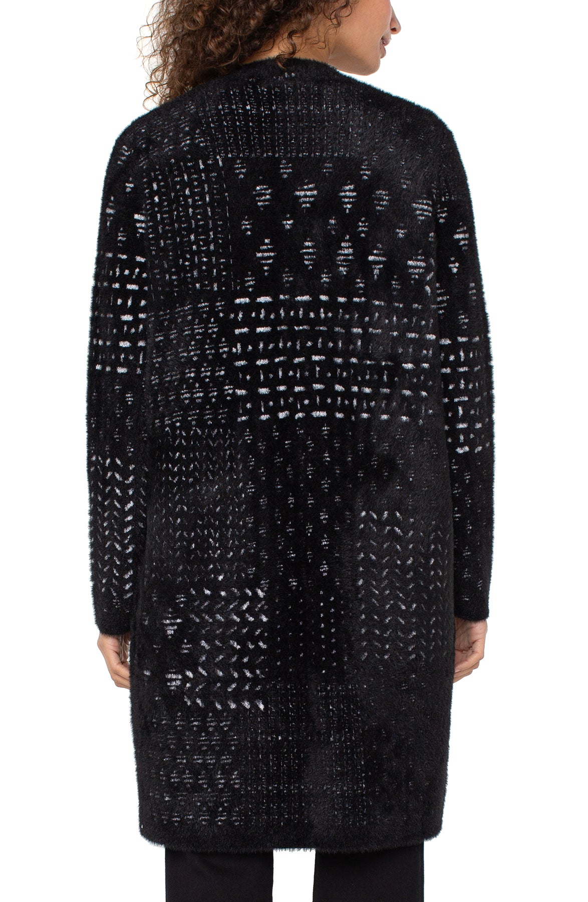 LONG SLEEVE COLLARLESS OPEN FRONT SWEATER COAT - BLACK/WHITE PATCHWORK
