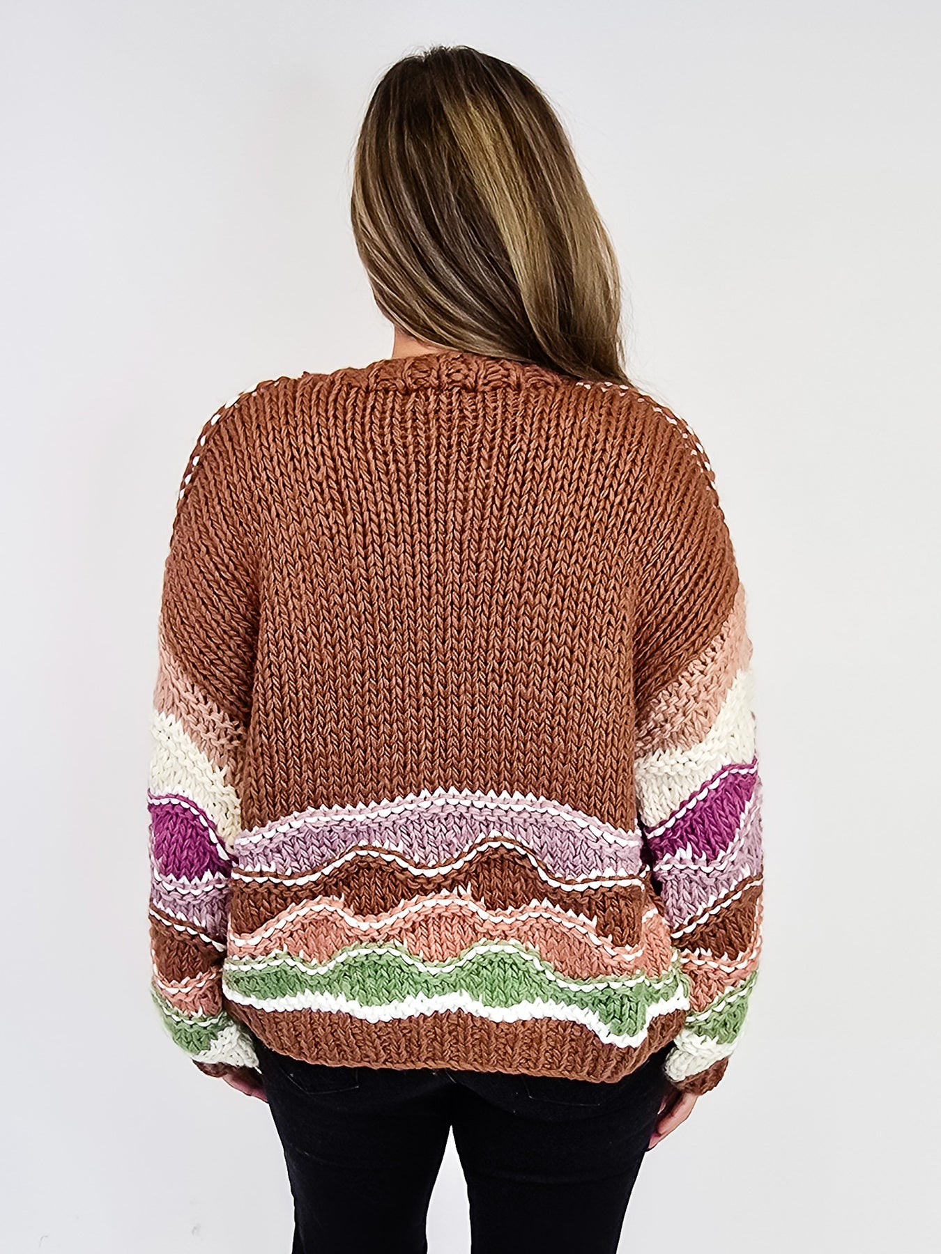 A vibrant, hand-knit style cardigan featuring bold wavy stripes in earthy and jewel-tone shades. Designed with a relaxed fit, deep V-neckline, oversized buttons, and ribbed trim.