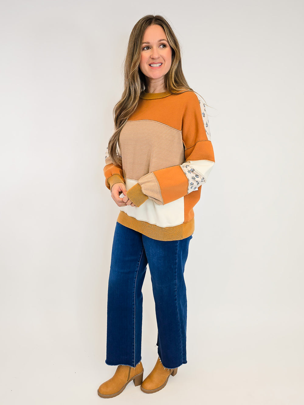 PRINT AND COLOR MIX WASHED TERRY PULLOVER - CAFE MOCHA