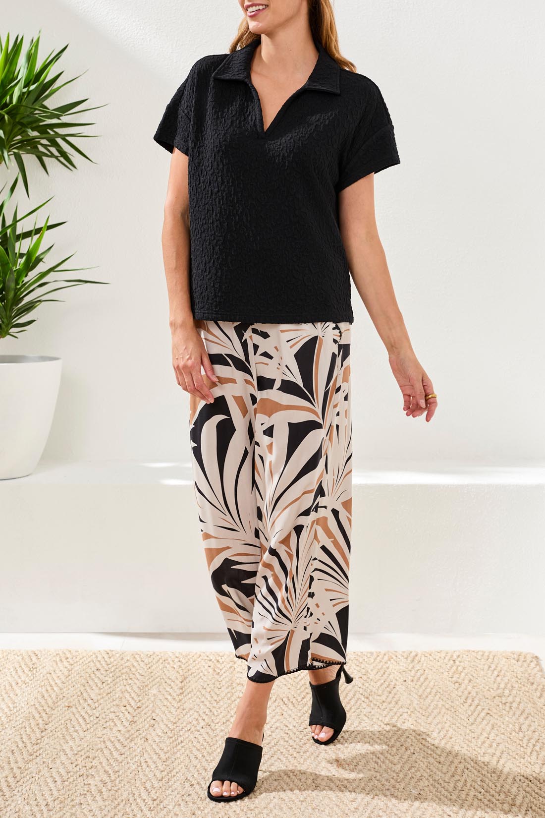 SHORT SLEEVE JOHNNY COLLAR TOP - BLACK