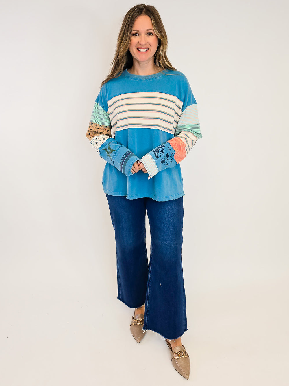 STRIPE MIX TERRY SOFT WASHED PULLOVER - FADED TEAL