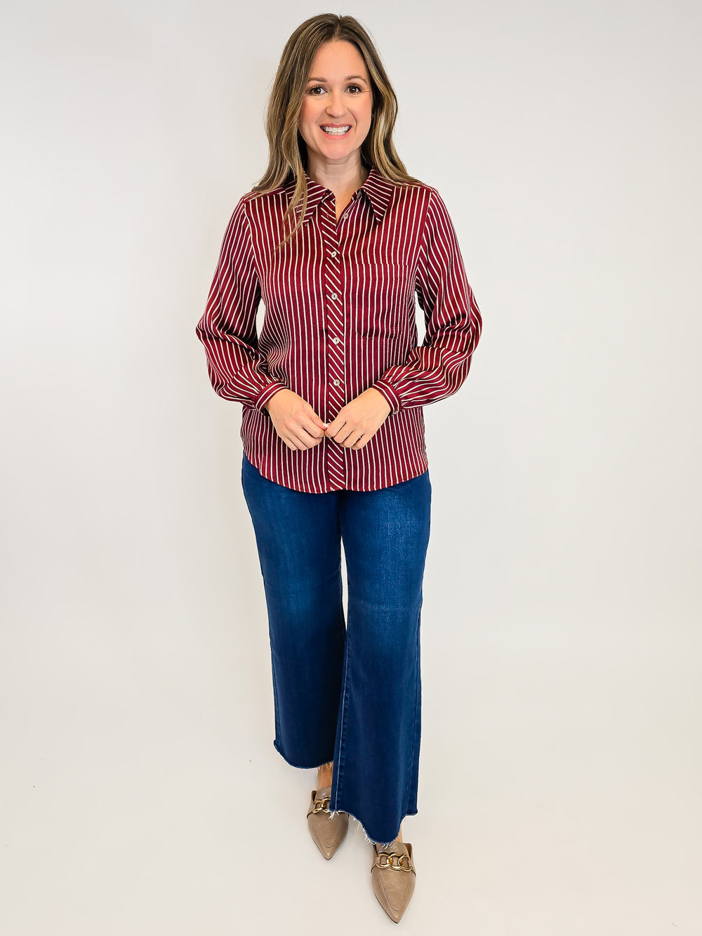 STRIPED BUTTON DOWN BLOUSE - BURGUNDY