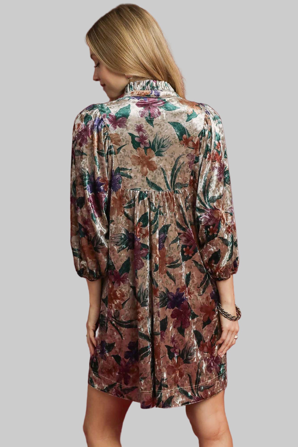VELVET FLORAL PRINT BALLOON SLEEVE SHORT DRESS - TAN/DARK GREEN MIX