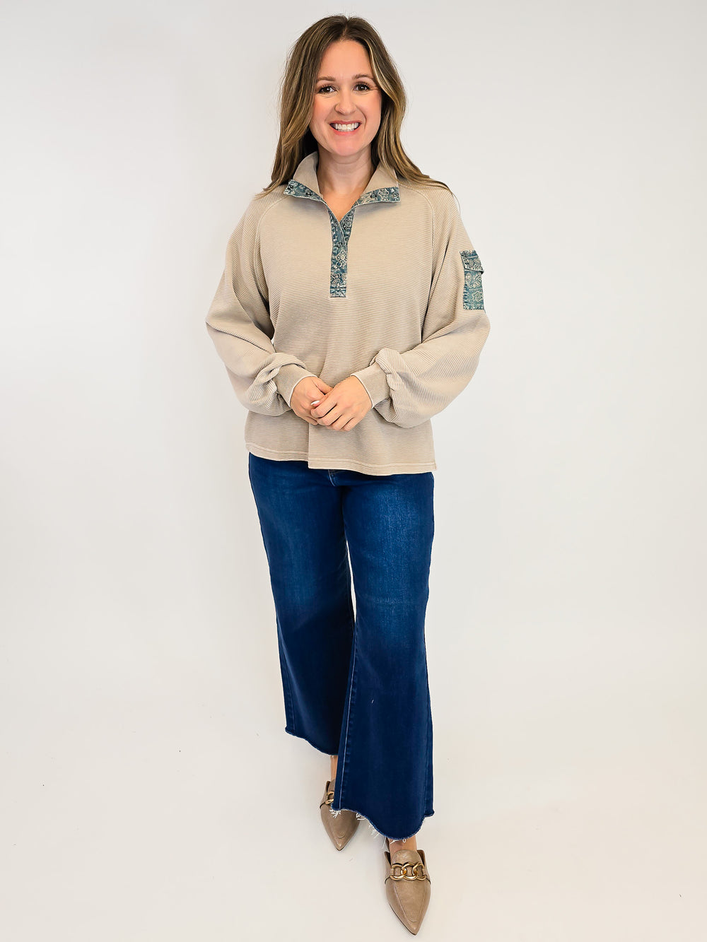 WASHED RIBBED TERRY COLLARED PULLOVER - KHAKI