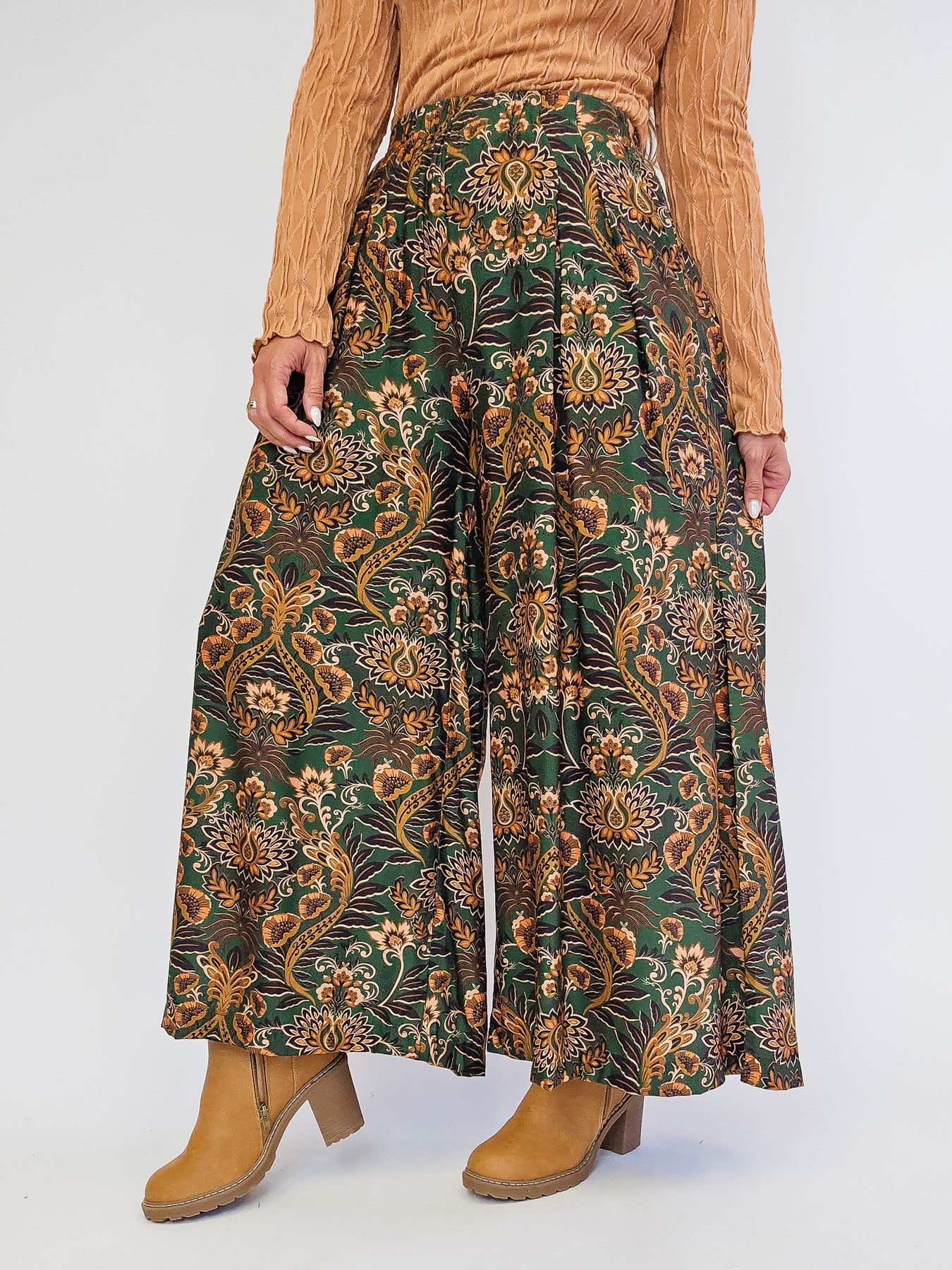 FLORAL PRINT WIDE LEG PALAZZO PANTS - OLIVE MIX