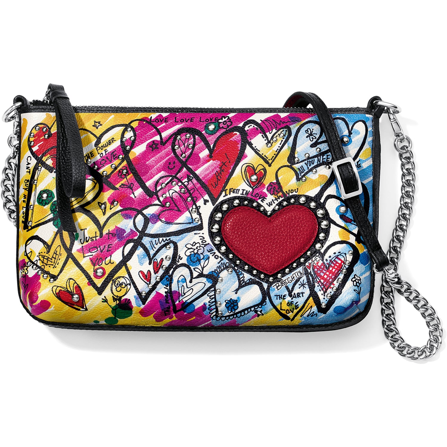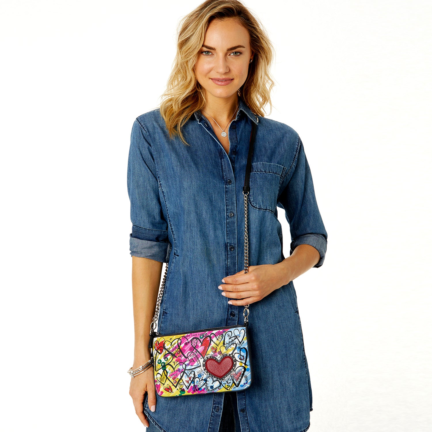 With a bold heart emblazoned on front, surrounded by hand-hammered studs, this crossbody pouch was made for the art of love! Its exclusive design was created by designer Tom Clancy.