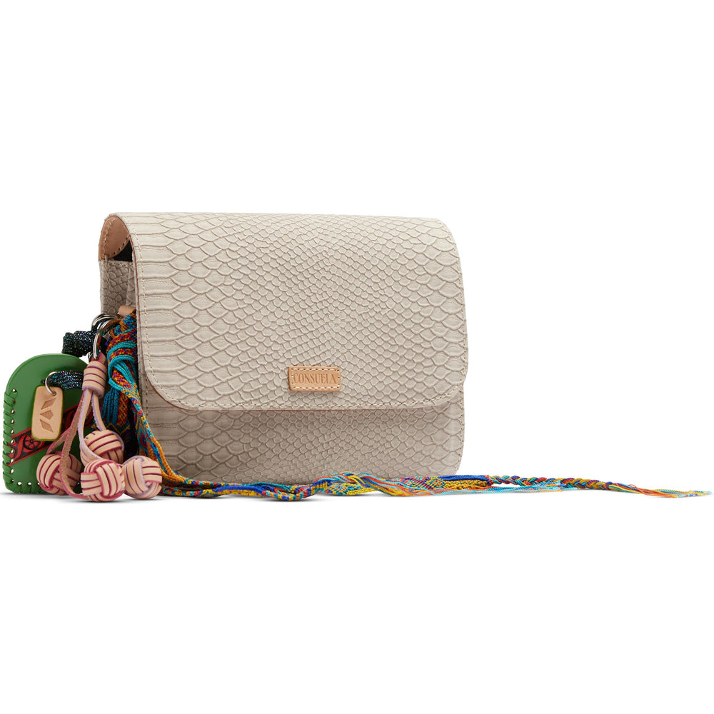 Make today ridiculously awesome with a Consuela tote, cross-body or satchel. Consuela bags are known for durability, vibrancy and carrying capacity. Brianne's Boutique has Indiana's largest selection of Consuela. Consuela's signature style includes mixing quality materials like genuine leather, denim and canvas. Each unique bag is then adorned with embroidery, patches, metallics and a colorful shoulder or cross-body strap. From a more subtle style made of the Diego leather to shiny metallics, you are sure to find the perfect bag to fit your personal style.