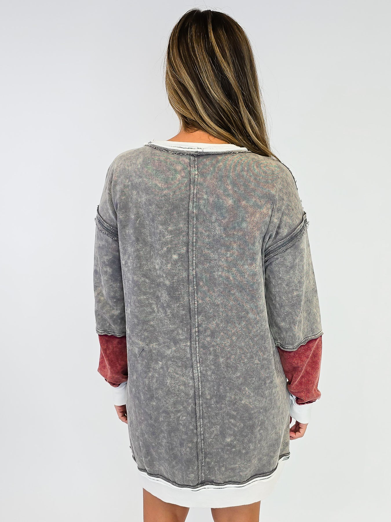 COLOR BLOCK LONG SWEATSHIRT DRESS- CHARCOAL MIX
