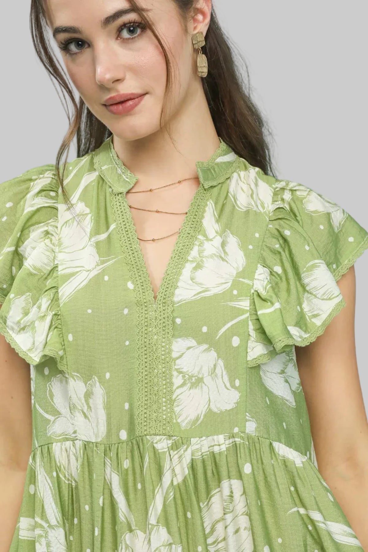 TWO TONE FLORAL PRINT MIDI DRESS - SAGE/CREAM