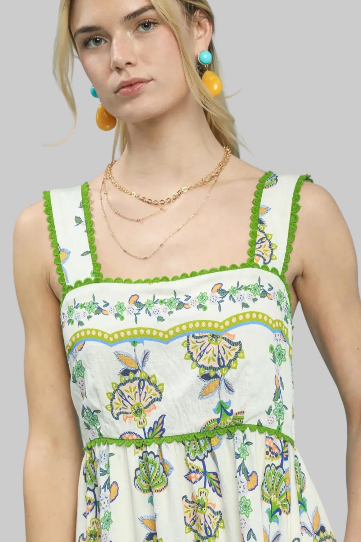 - Wide straps with scalloped trim