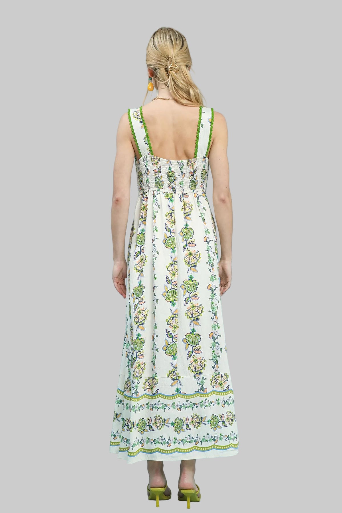 WIDE STRAP FLORAL PRINT TIERED MIDI DRESS - GREEN