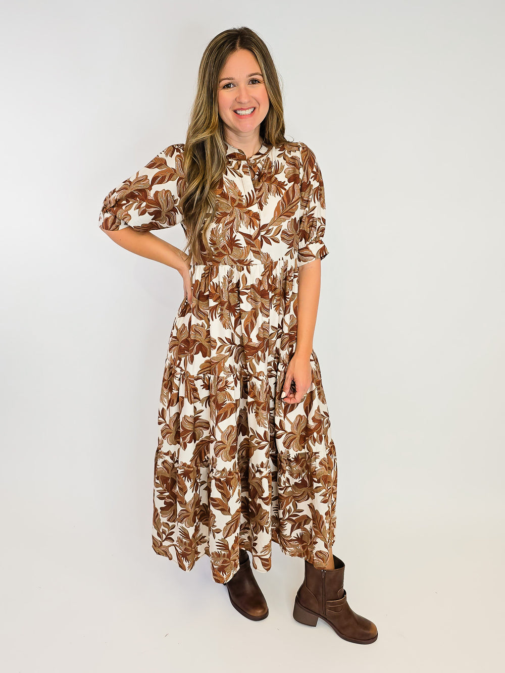 BOHO LEAF PRINT TIERED MIDI DRESS - BROWN MIX