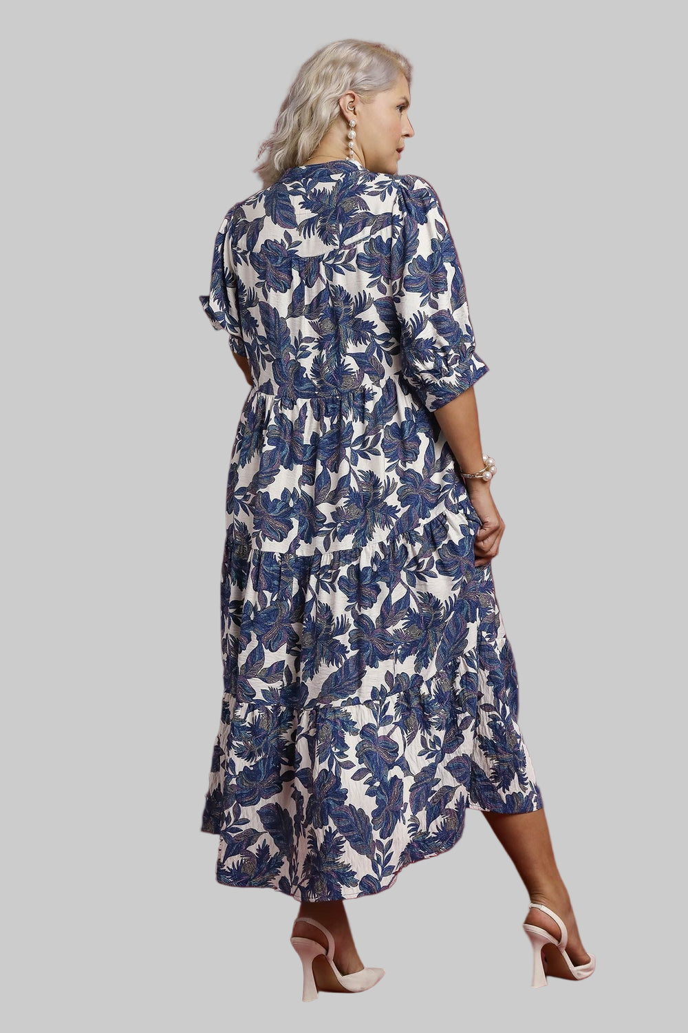 BOHO LEAF PRINT TIERED MIDI DRESS - NAVY MIX