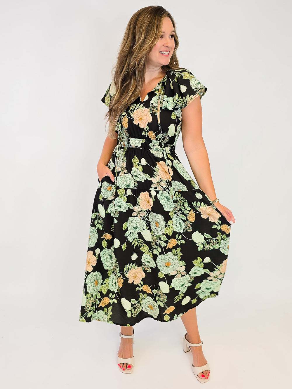 FLORAL PRINTED MIDI DRESS W/FLUTTER SLEEVES - BLACK/SAGE
