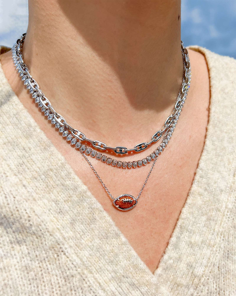 Our signature pendant style in a football shape? Touchdown! The Football Silver Short Pendant Necklace in Orange Goldstone is the perfect way to put the “game” in your game day look. Layer with your favorite chain or wear as a standalone necklace—either way, you’ll be the most stylish fan in the stands.