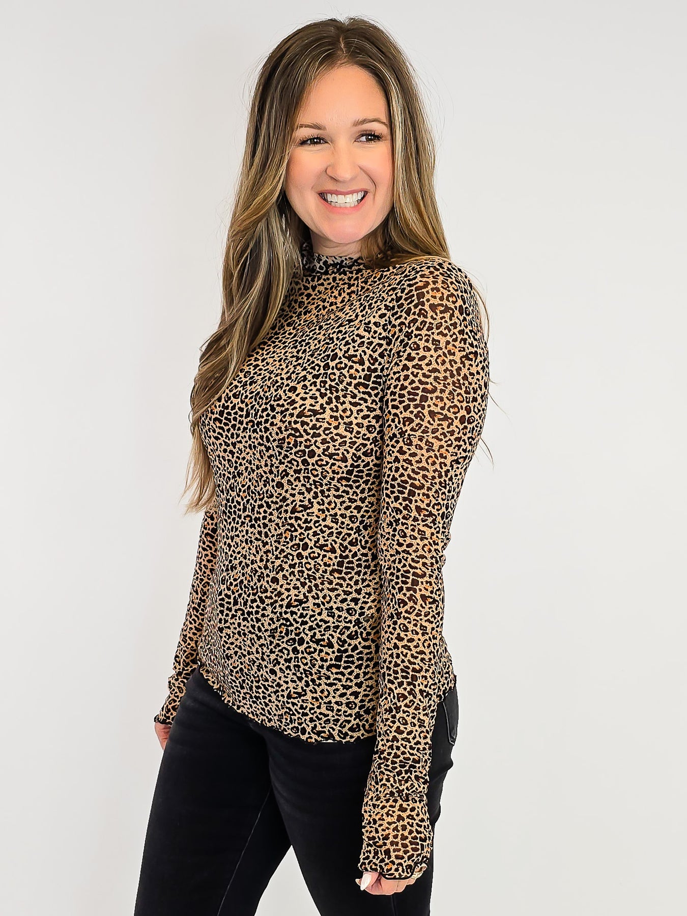 ANIMAL PRINT MESH MOCK NECK LONG SLEEVE TOP - TAUPE/BLACK