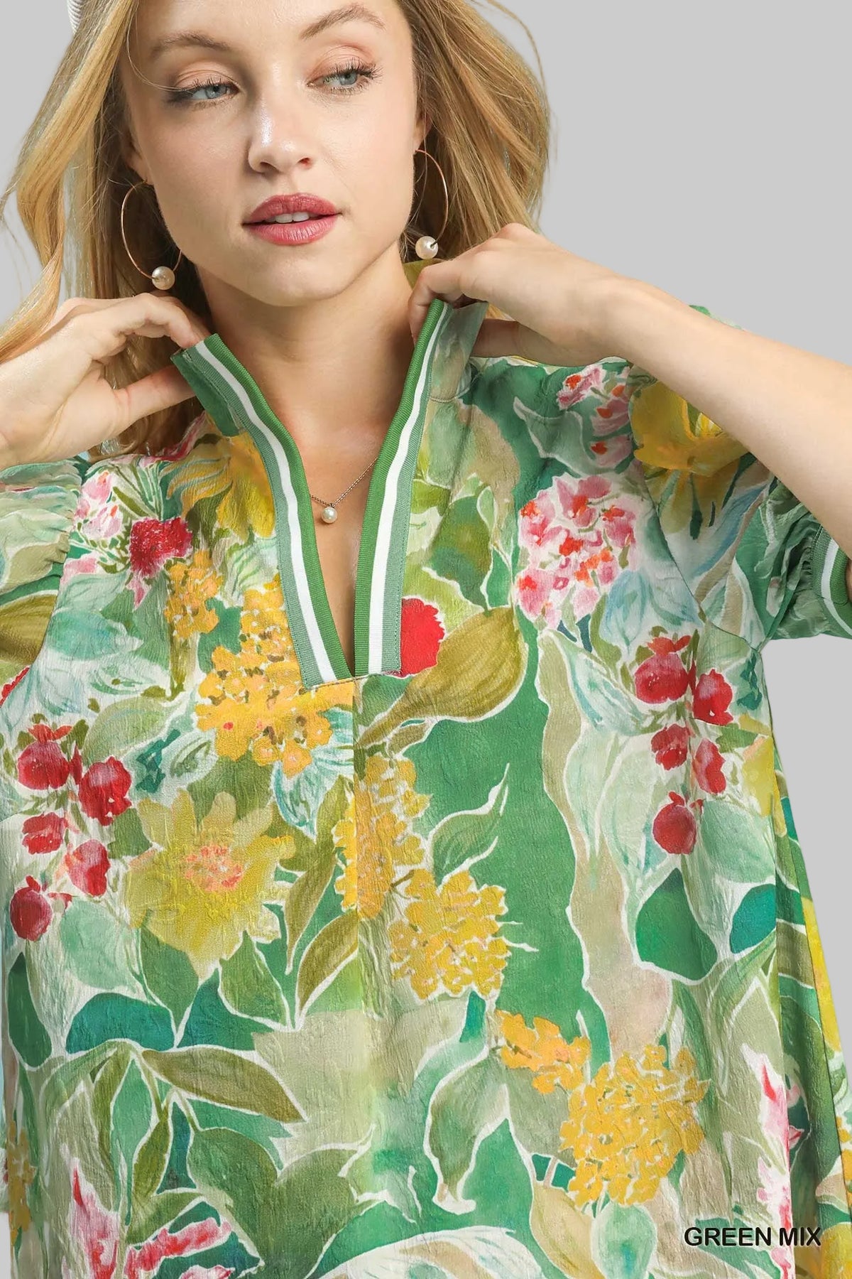 BLOOMSCAPE PRINT SHORT DRESS W/STRIPE BAND TRIM - GREEN MIX