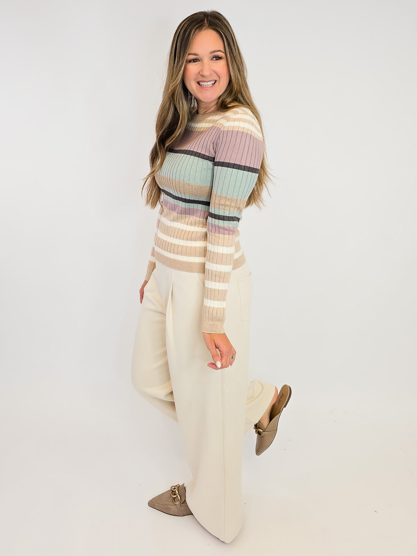 COLOR BLOCK STRIPED RIBBED KNIT SWEATER - IVORY/LATTE