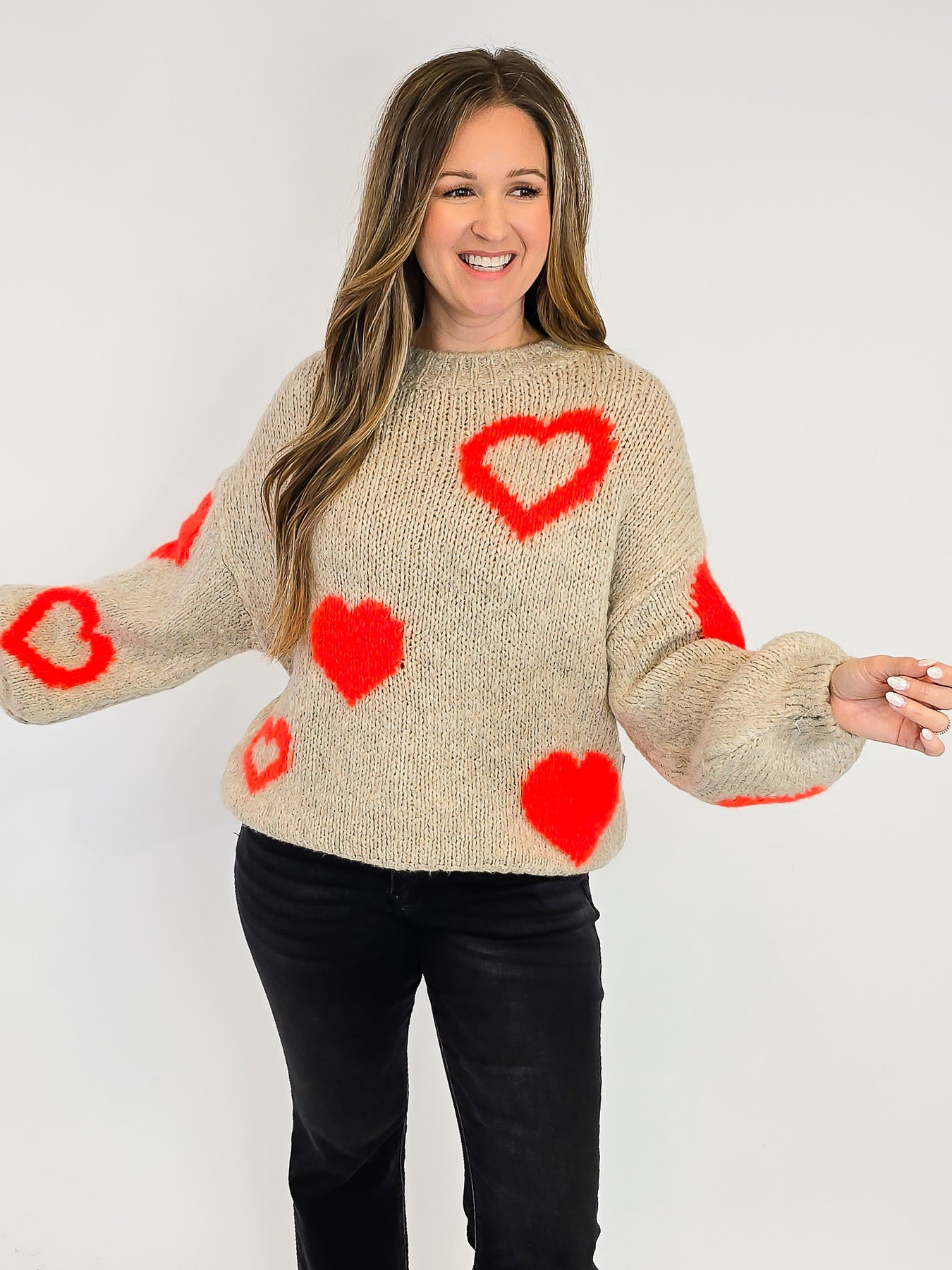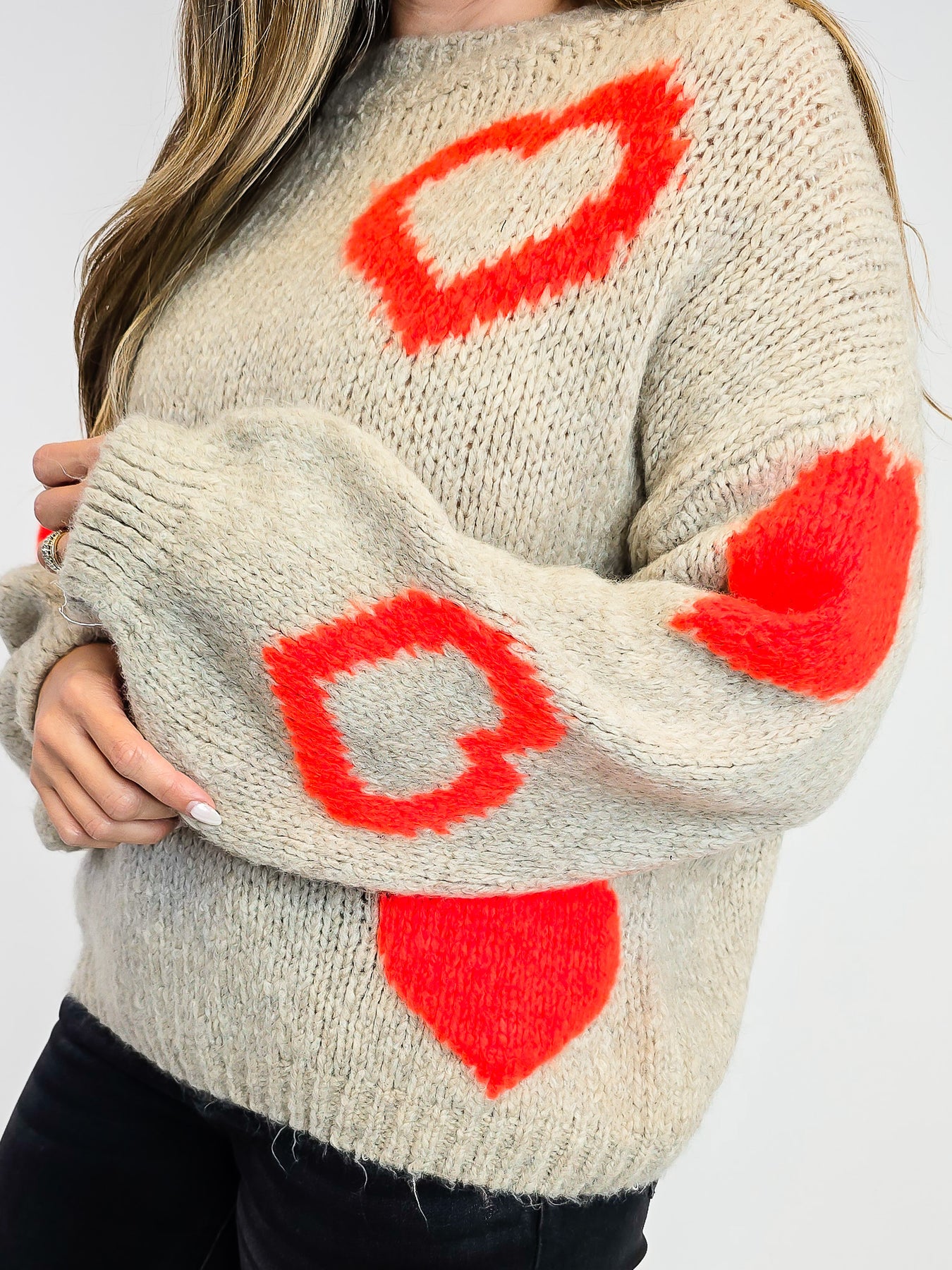 DOLMAL PUFF LONG SLEEVE HEART SWEATER - ONE SIZE - TAN/NEON ORANGE