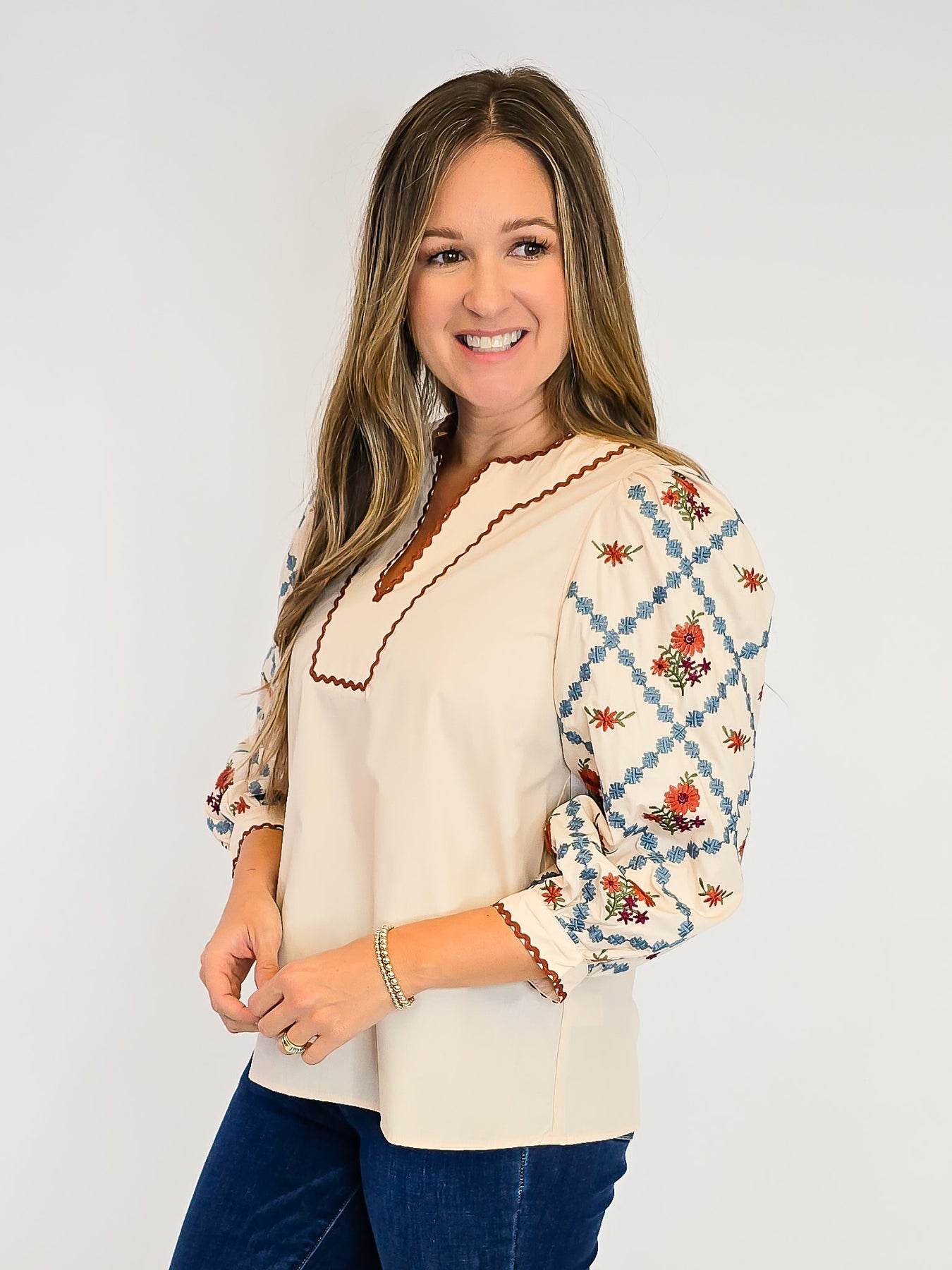EMBROIDERED 3/4 SLEEVE TOP - ECRU