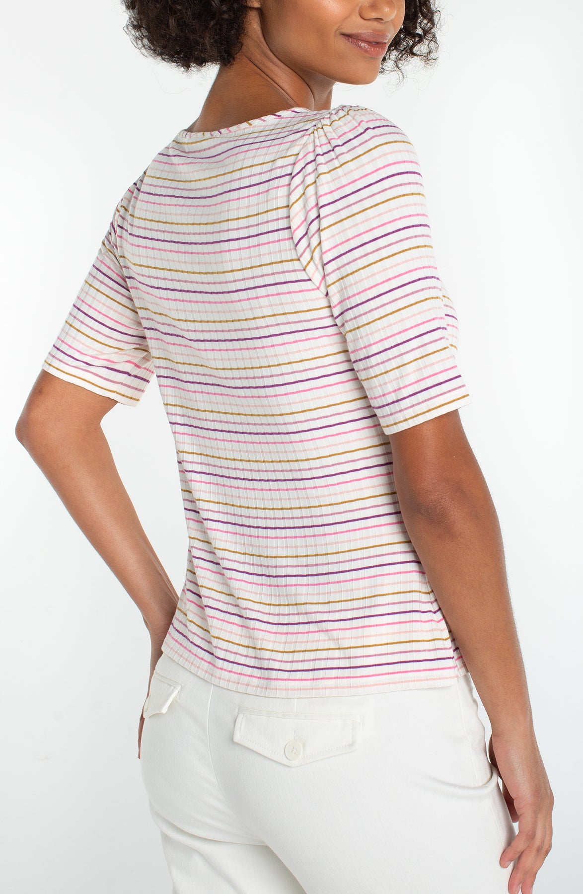 HALF SLEEVE SWEATHEART KNIT TOP - CREAM/PINK STRIPE