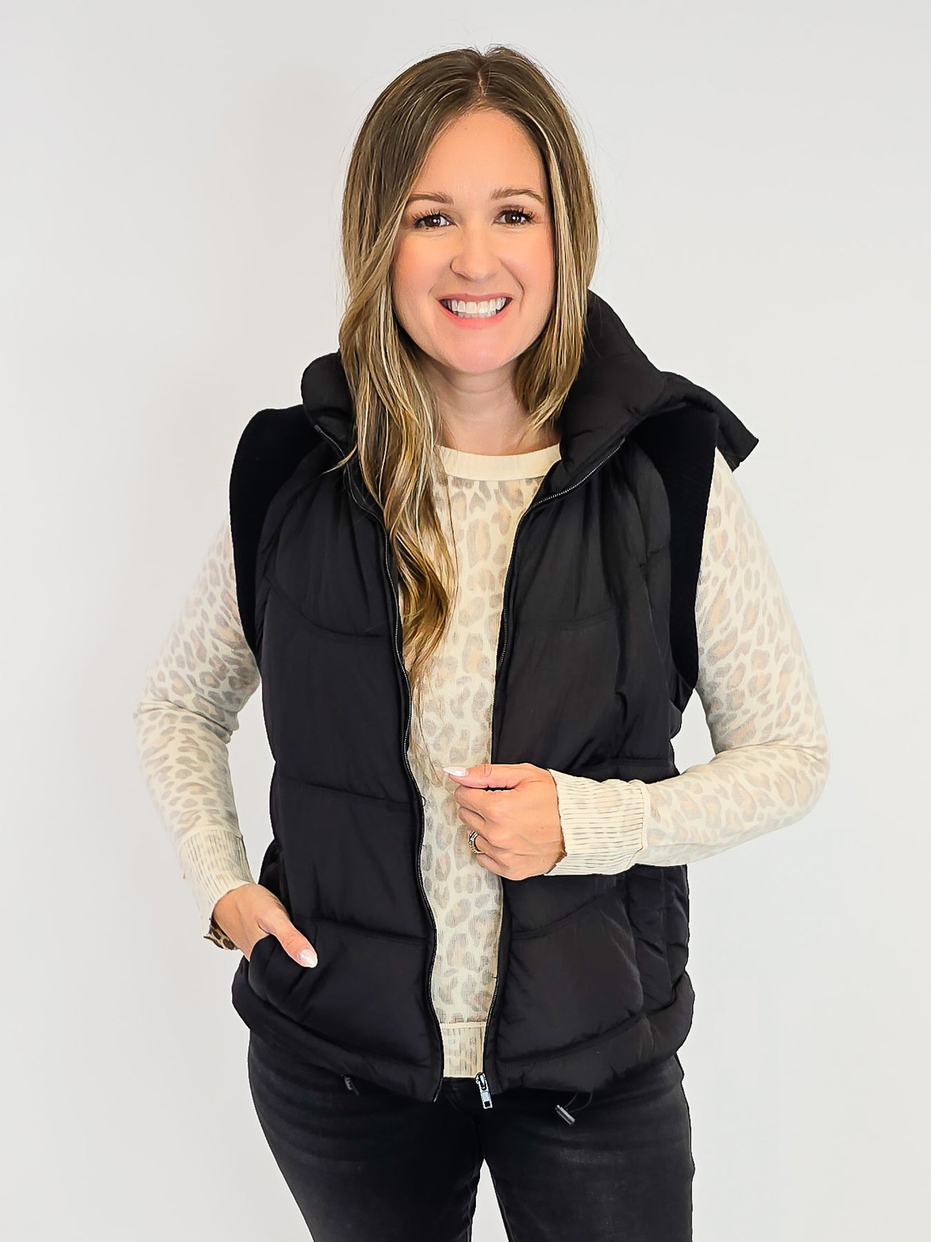 HOODED PUFFER VEST W/SWEATER RIB DETAIL - BLACK