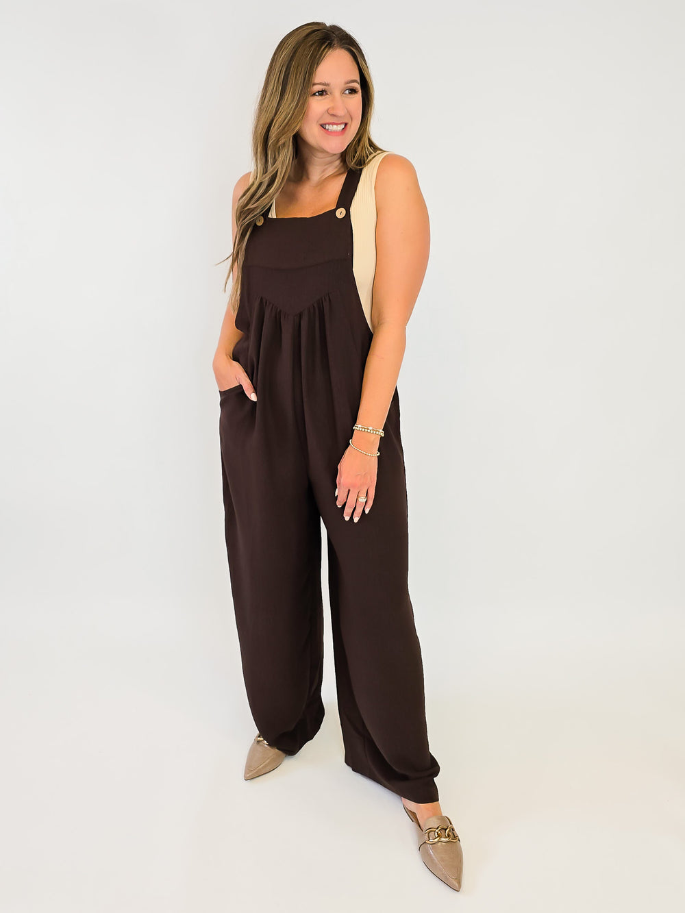 FLOWY POCKET JUMPSUIT W/ BUTTONS - BROWN