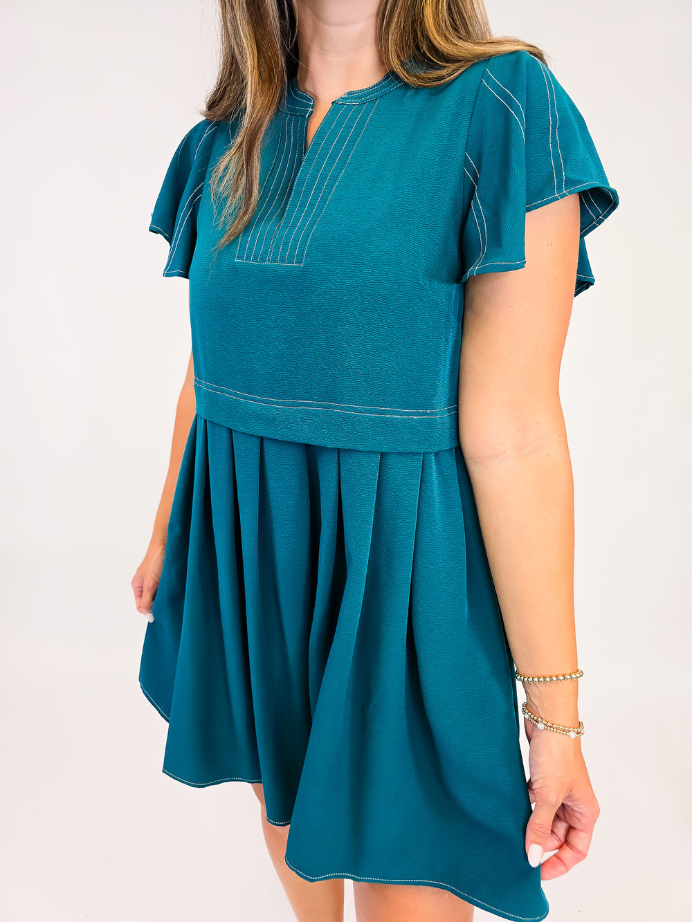 FLUTTER SLEEVE PLEATED SHORT DRESS - TEAL