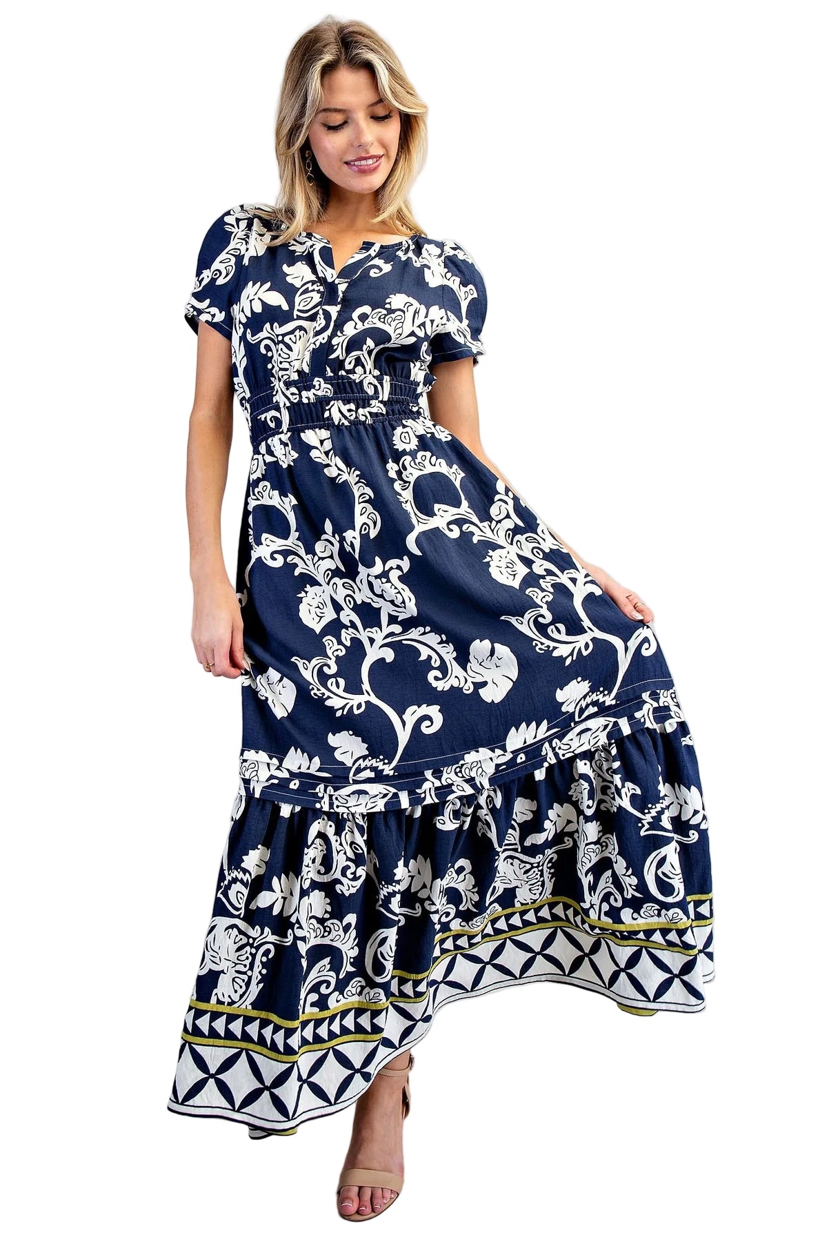 PRINTED ELASTIC WAIST MAXI DRESS - SAPPHIRE VEIL