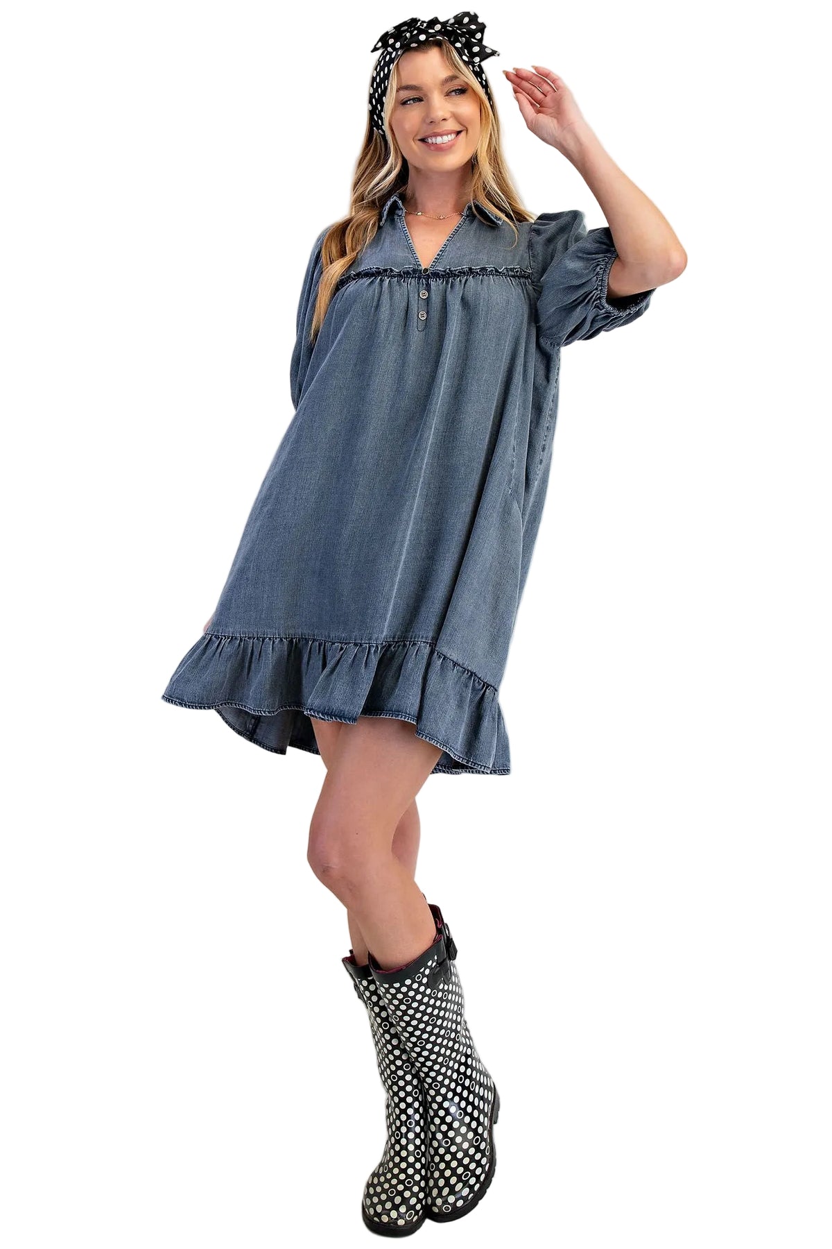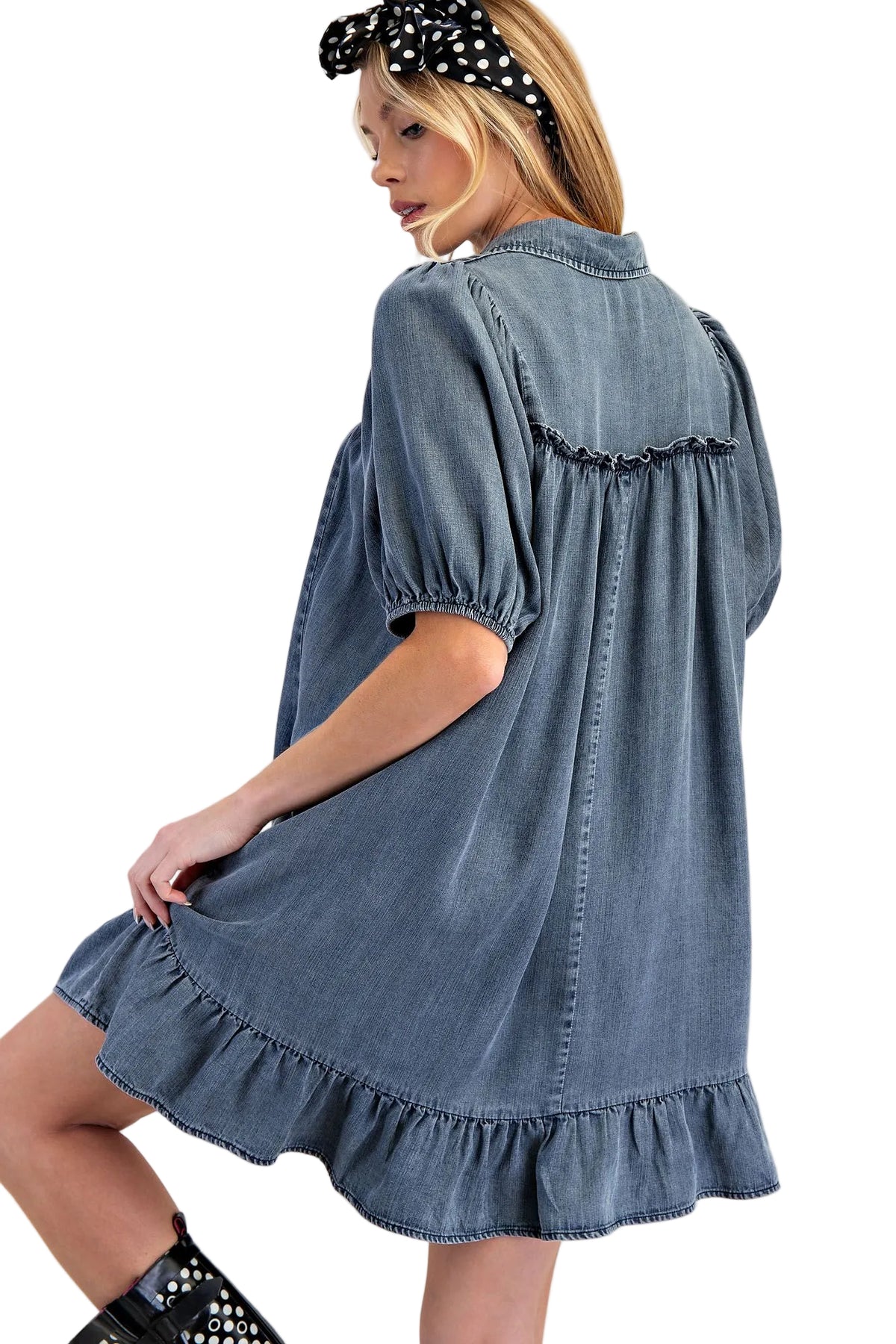 RUFFLE BOTTOM WASHED CHAMBRAY SHORT DRESS - WASHED DENIM