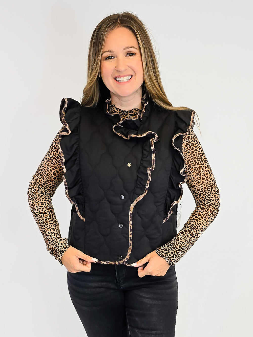 QUILTED RUFFLE VEST W/LEOPARD TRIM - BLACK