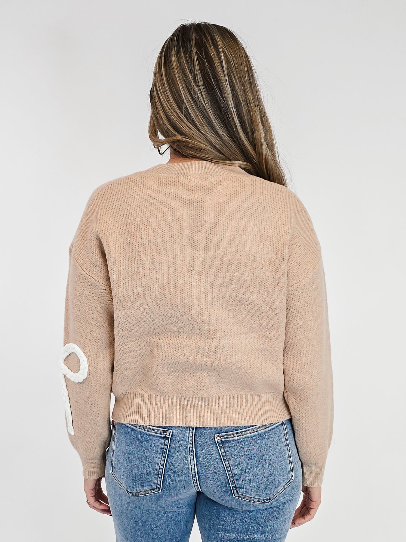 LONG SLEEVE BRAIDED BOW SWEATER - TAUPE