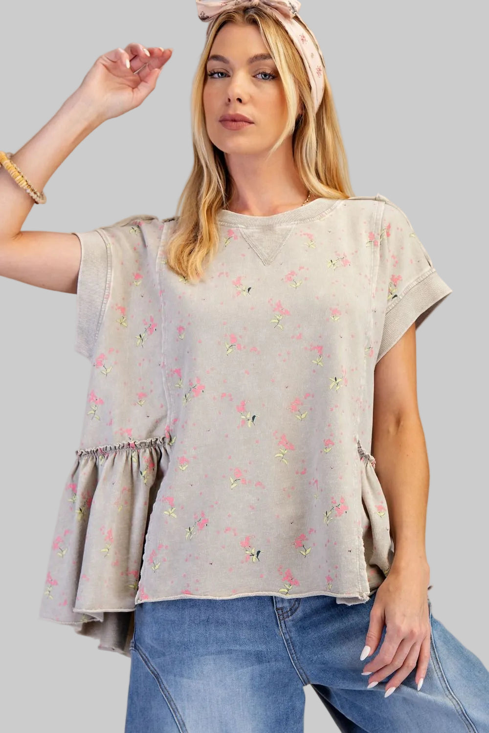 FLORAL PRINTED WASHED TERRY TUNIC TOP - ROCK STONE