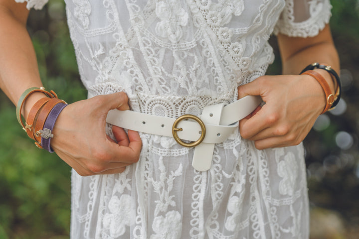 The brass-toned circle buckle leather belt is one of our best-selling belts. Made with genuine leather and a single brass-toned ring buckle, it is sure to bring out a minimalistic yet fashionable look. This brass-toned circle buckle leather belt is a wardrobe staple, available in black, tan, camel, and white and multiple sizes to accommodate various styles from casual to formal wear. Made with genuine leather for lasting quality and a timeless style, this will definitely be an outfit staple for years to come.