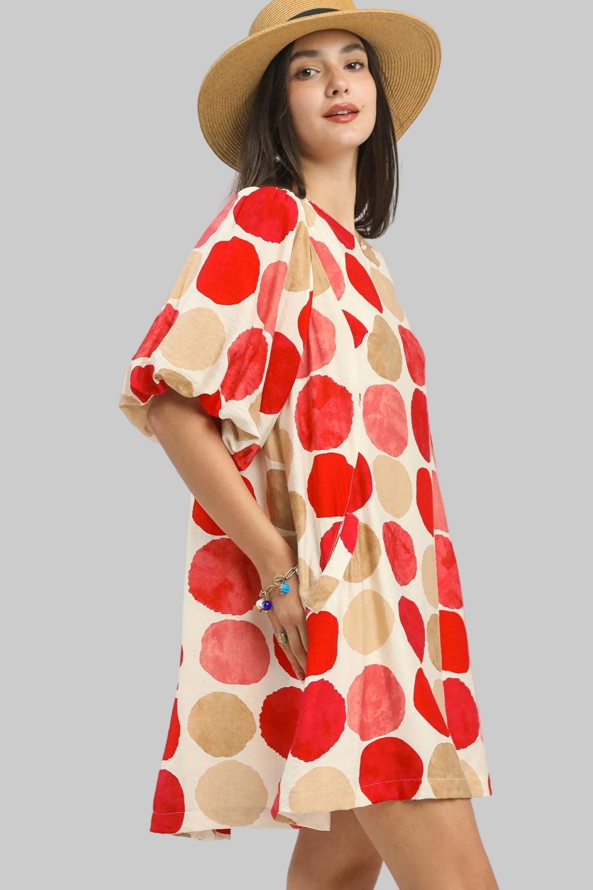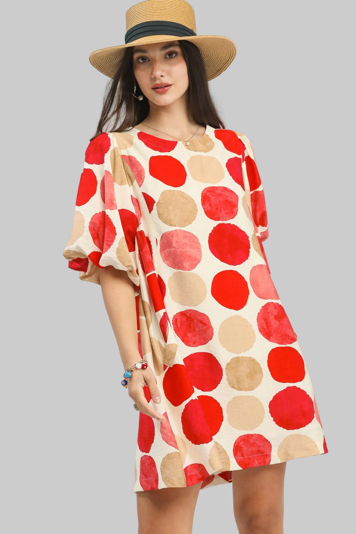 BUBBLE SLEEVE CIRCLE PRINT CONTRAST SHORT DRESS - RED MIX
