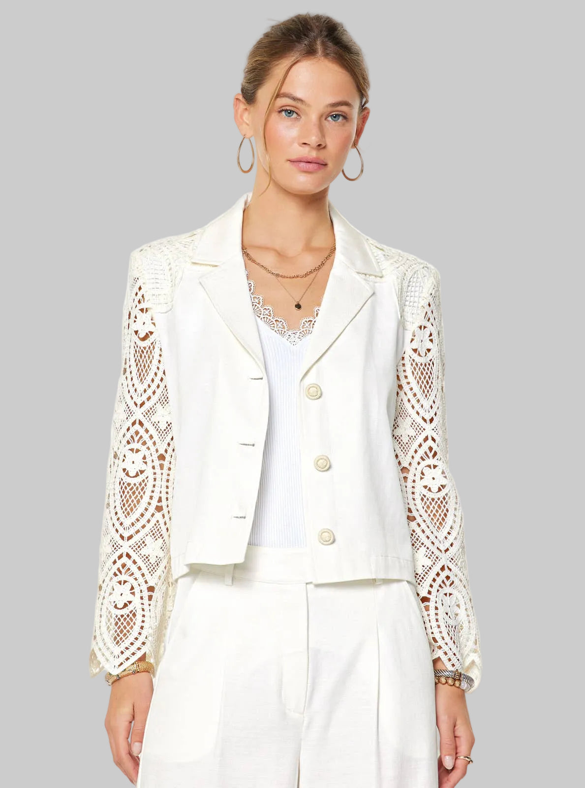 Our Crochet Lace Detail Jacket is a perfect example of our approachable aesthetic. This contemporary, classic, and formal jacket, designed for the modern woman, features beautiful lace details and long sleeves - ideal for spring/summer.