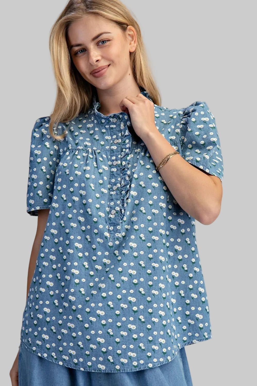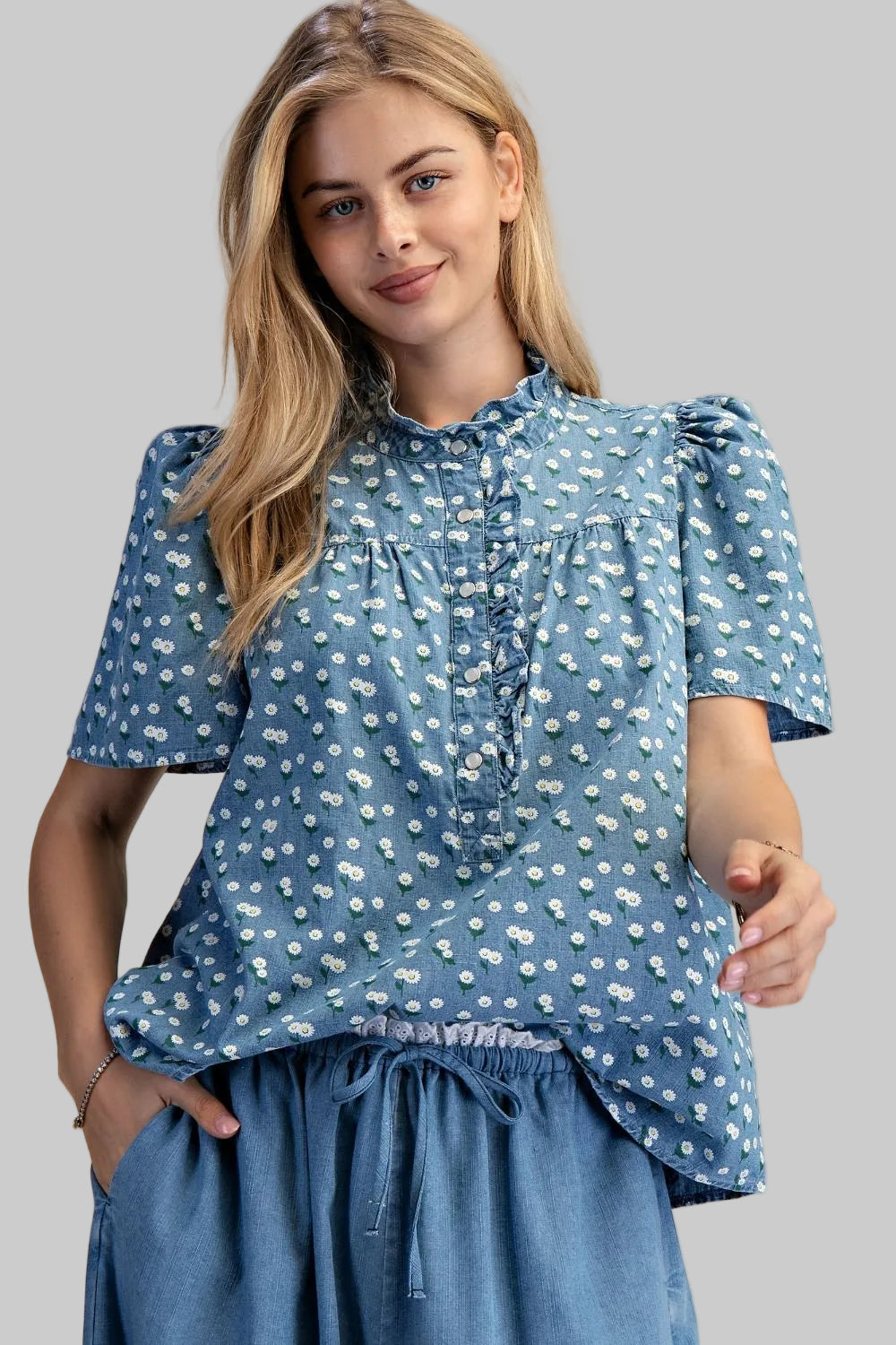 SHORT PUFF SLEEVE FLORAL DENIM BLOUSE - WASHED DENIM